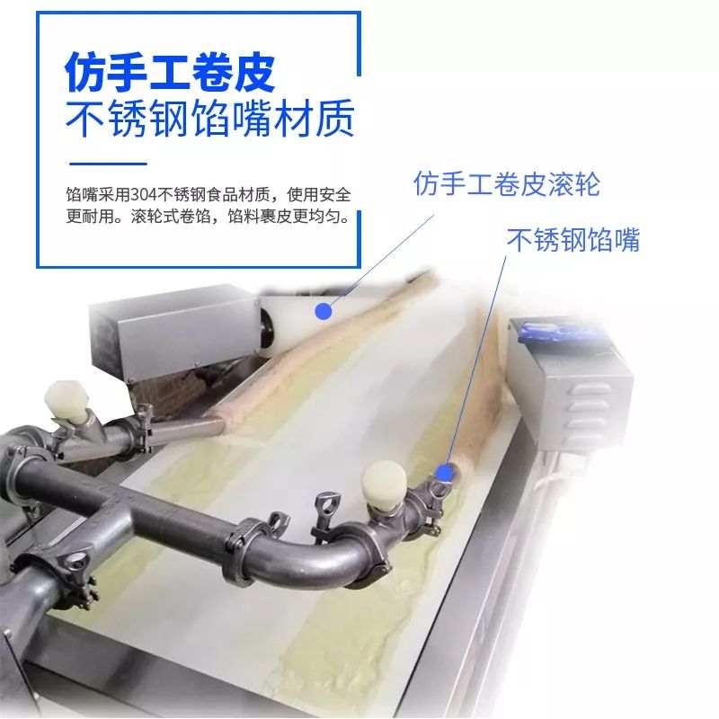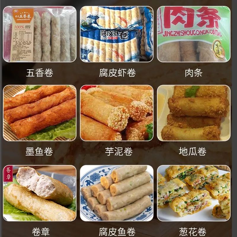 / 腐皮卷機(jī)是一款完全取代手工包各種腐皮類(lèi)的機(jī)器,完全解決傳統(tǒng)手工包個(gè)種肉卷、卷章、魚(yú)卷、蝦卷、福建五香卷、潮汕肉條、腐皮蝦卷、墨魚(yú)卷、芋泥卷、地瓜卷等各種卷類(lèi)食品。做出的各種卷類(lèi)食品造型好看、長(zhǎng)短均勻,葉片泵的供料機(jī)不破壞物料原有形狀,獨(dú)有的圓形收口切斷設(shè)計(jì)使其接近手工制作。全自動(dòng)包漿、卷?xiàng)l、切斷成型,大大的提升了生產(chǎn)效率,滿足了批量化生產(chǎn)的速度要求。/